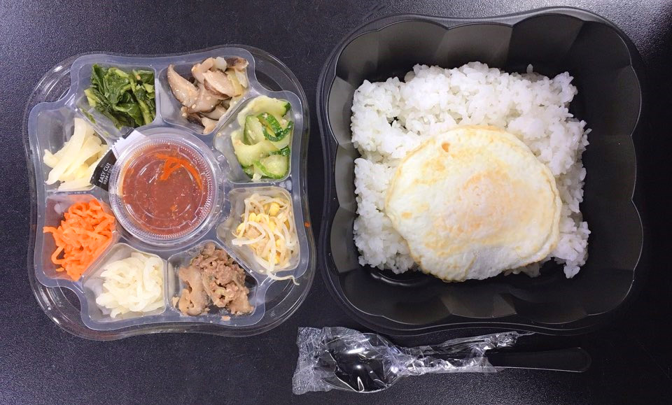 8가지 야채, 참기름, 고추장, 계란후라이, 밥이 포함되어있다. 포크숟가락도 들어있다.