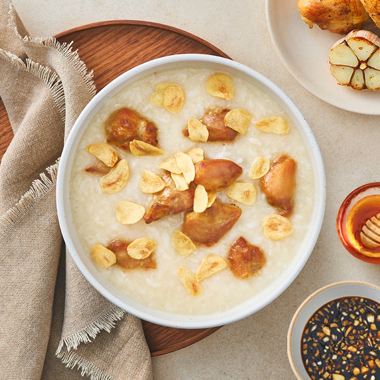 "꿀 간장 소스로 맛을 내 달콤 짭조름, 감칠맛 가득한 닭다리살 구이에 서산 6쪽마늘의 알싸한 풍미를 더해 한층 더 깊고 풍부한 맛!" 이라고 6쪽마늘닭죽을 소개하고 있다.