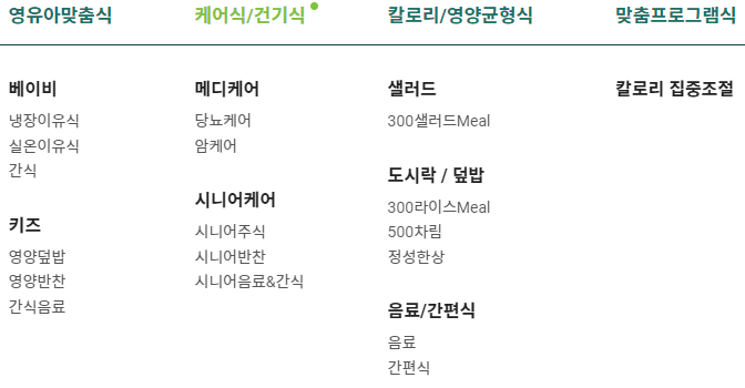 300샐러드, 300라이스, 500차림, 정성한상, 베이비키즈, 메디케어, 시니어케어 등등 다양한 종류가 있었다(그림 1).