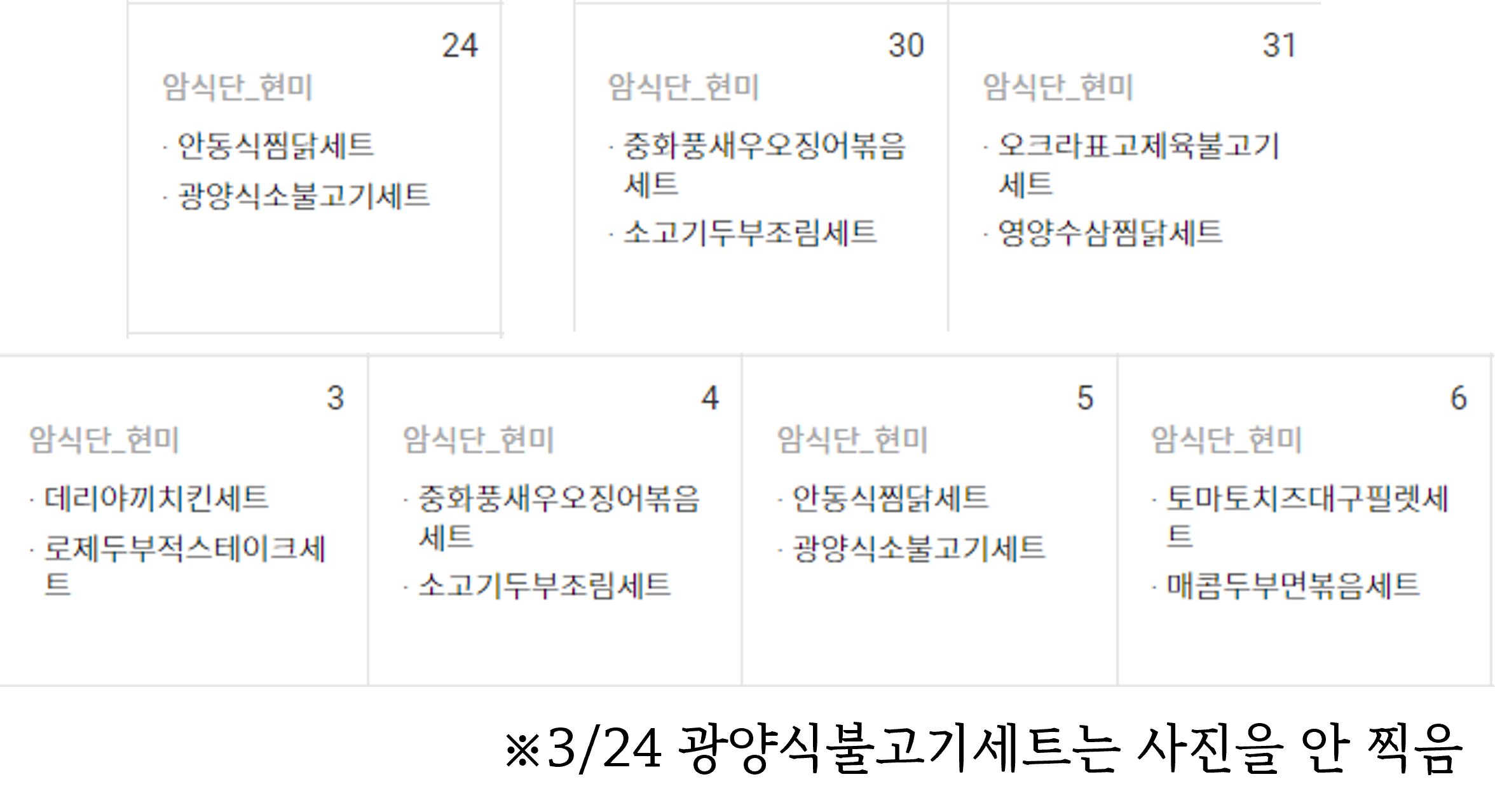 단점은, 주머니 사정이 어려워진다는 점(한끼에 1만 2천원, 하루 2만 4천원). 몇 주 이상 구독하면 같은 메뉴가 심심하게 느껴질 수도 있을 것 같다.