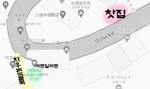 - 지우펀 메인 거리 초입에서 조금 더 올라가서 버스정류장 옆에 위치하고 있다.