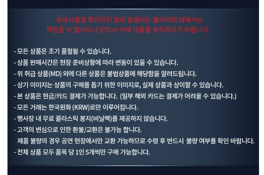 참고로 볼캡 모자는 괜찮을 것 같은데, 돌출된 헤어악세사리의 경우에는 뒷사람의 관람이 방해될 수 있어 공연 중에는 빼달라고 한다.