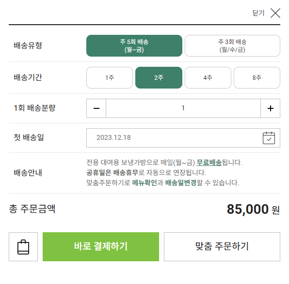아래 그림과 같이 홈페이지에서 주문할 때 ‘주 5일’, ‘주 3일’ 옵션으로 간편하게 설정할 수도 있고(그림 A) ‘맞춤주문하기’ 버튼을 이용해 나처럼 달력에 구독 받은 날짜와 아닌 날짜를 정할 수도 있다(그림 B).