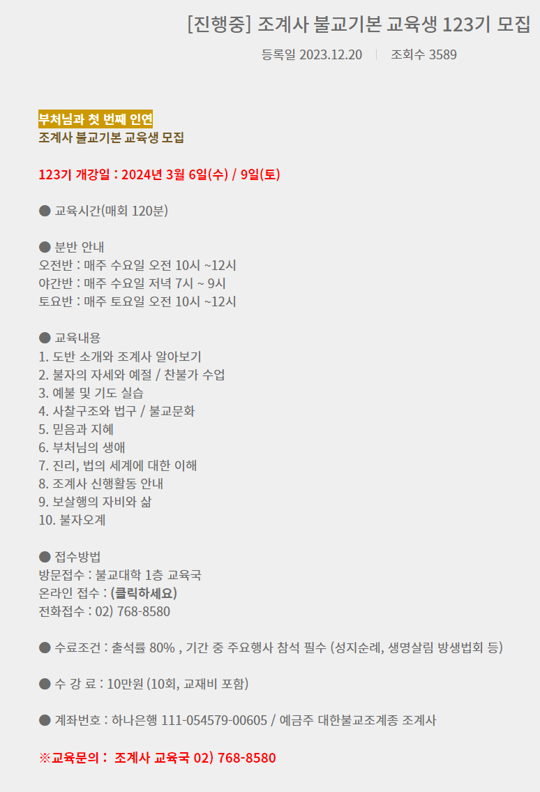 [123기 조계사 불교기본교육 공고]