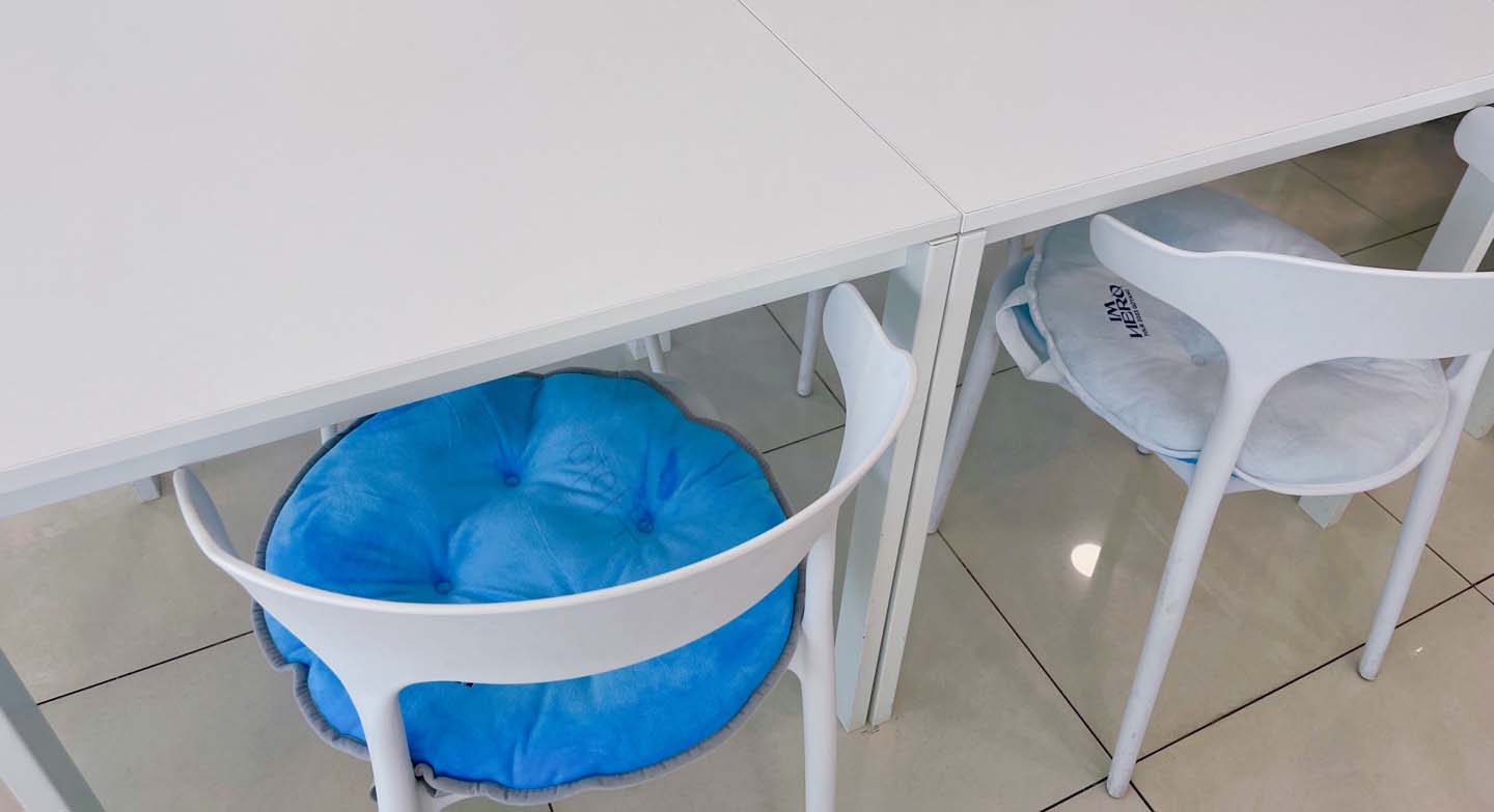흰색 테이블과 흰 의자였고, 자리마다 전국 콘서트 방석이 종류별로 깔려있었다.