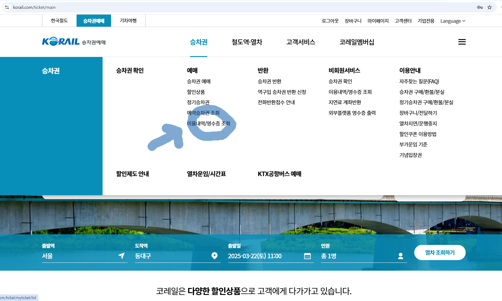 (3) 승차권>예매>이용내역/영수증 조회 로 들어갑니다.
