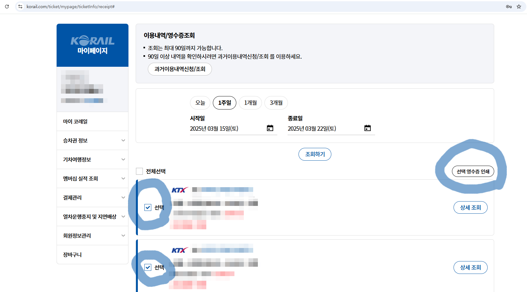 (3) 승차권 번호를 입력하여 영수증을 조회합니다.