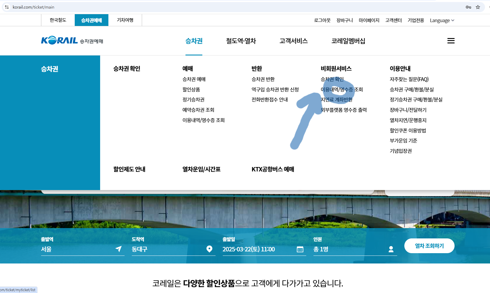 (2) 승차권>비회원서비스>이용내역/영수증 조회를 선택합니다.