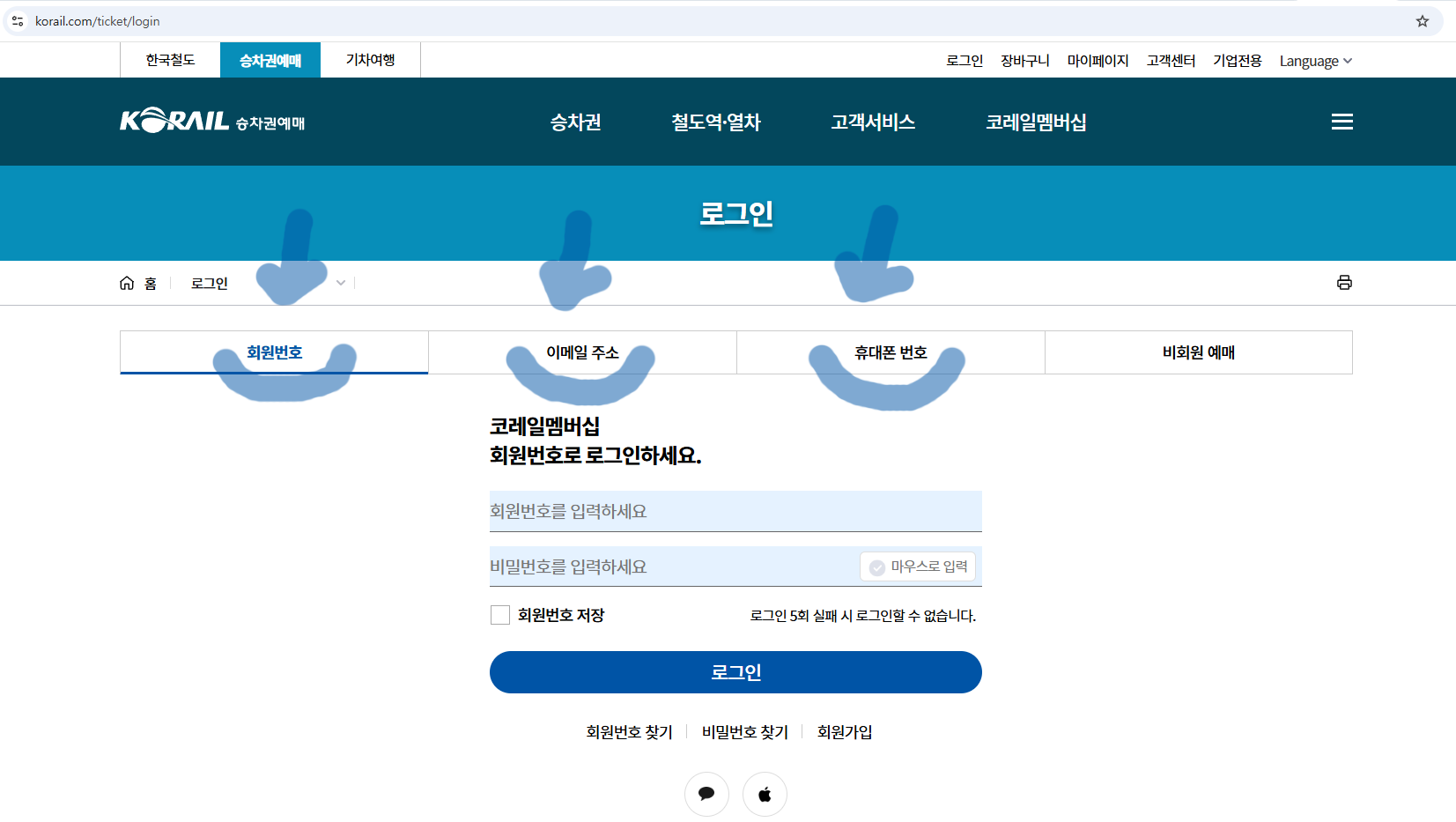 (1) '로그인'을 눌러 로그인합니다. 회원번호, 이메일주소, 휴대폰 번호 등으로 가능합니다(빨간색 동그라미).