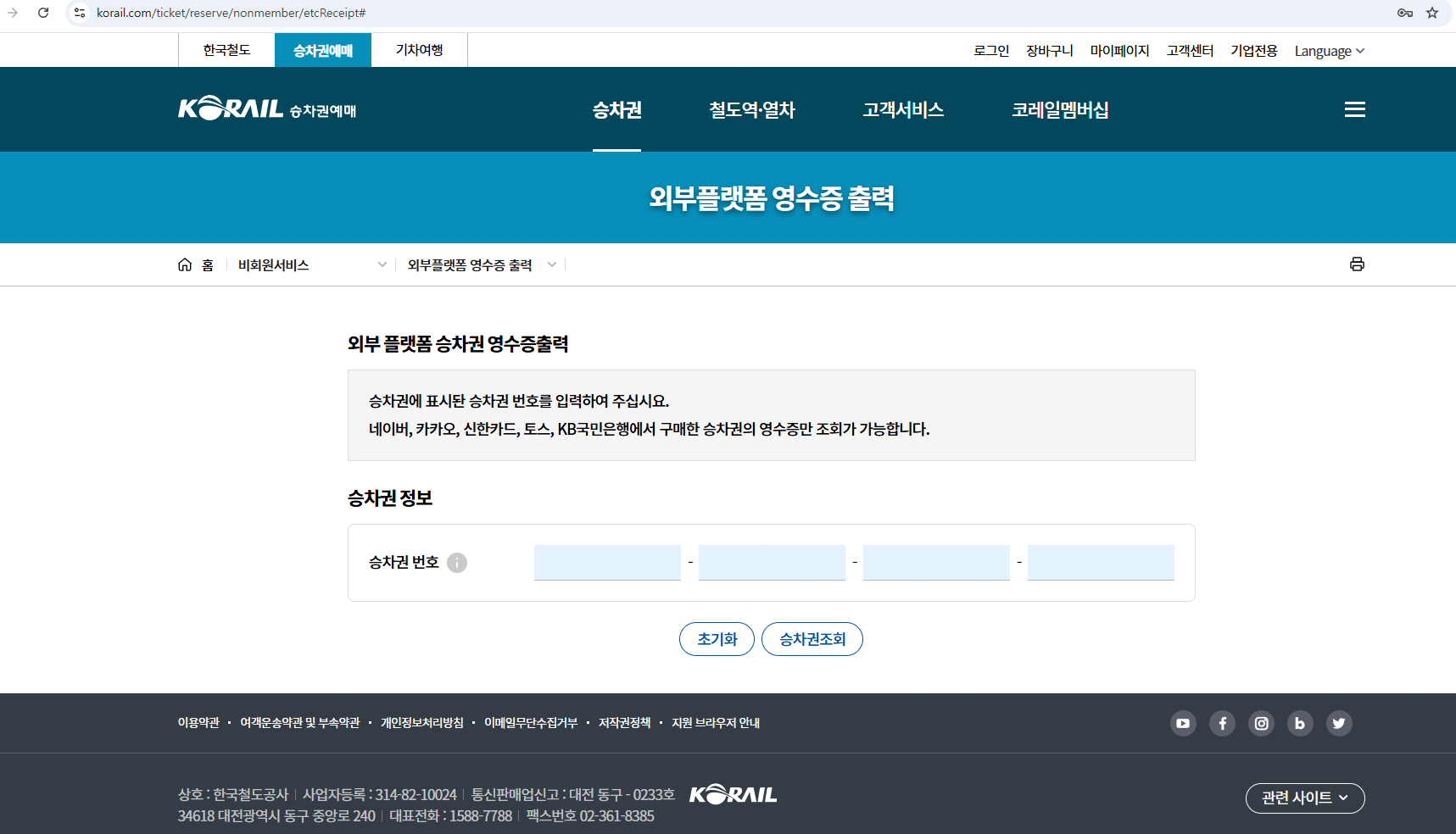 (2) 승차권>비회원서비스>외부플랫폼 영수증 출력을 선택합니다.